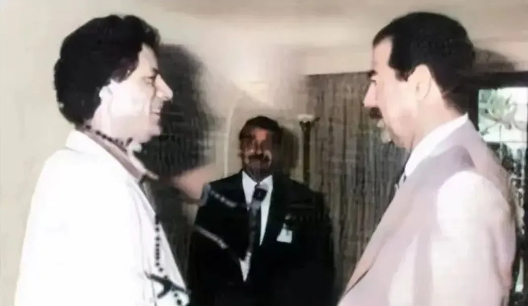 这张合影是会面,屋里挂着帘子,地毯软,两个男人面对面站着,笑意挂在嘴角不多不少,手上松松垮垮的念珠垂着,像在敲打节拍,空气里有种客套的温度。