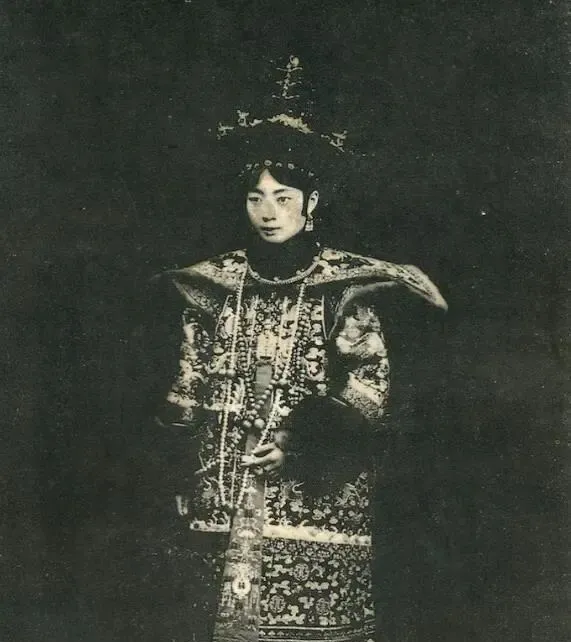 这张黑白照穿的是大礼服,绣线密密麻麻,肩上展了一对如翼的襻,额前垂着珠穗,眼神淡淡往下看,像是刚行过礼退到一旁,静得能听见衣摆摩擦。