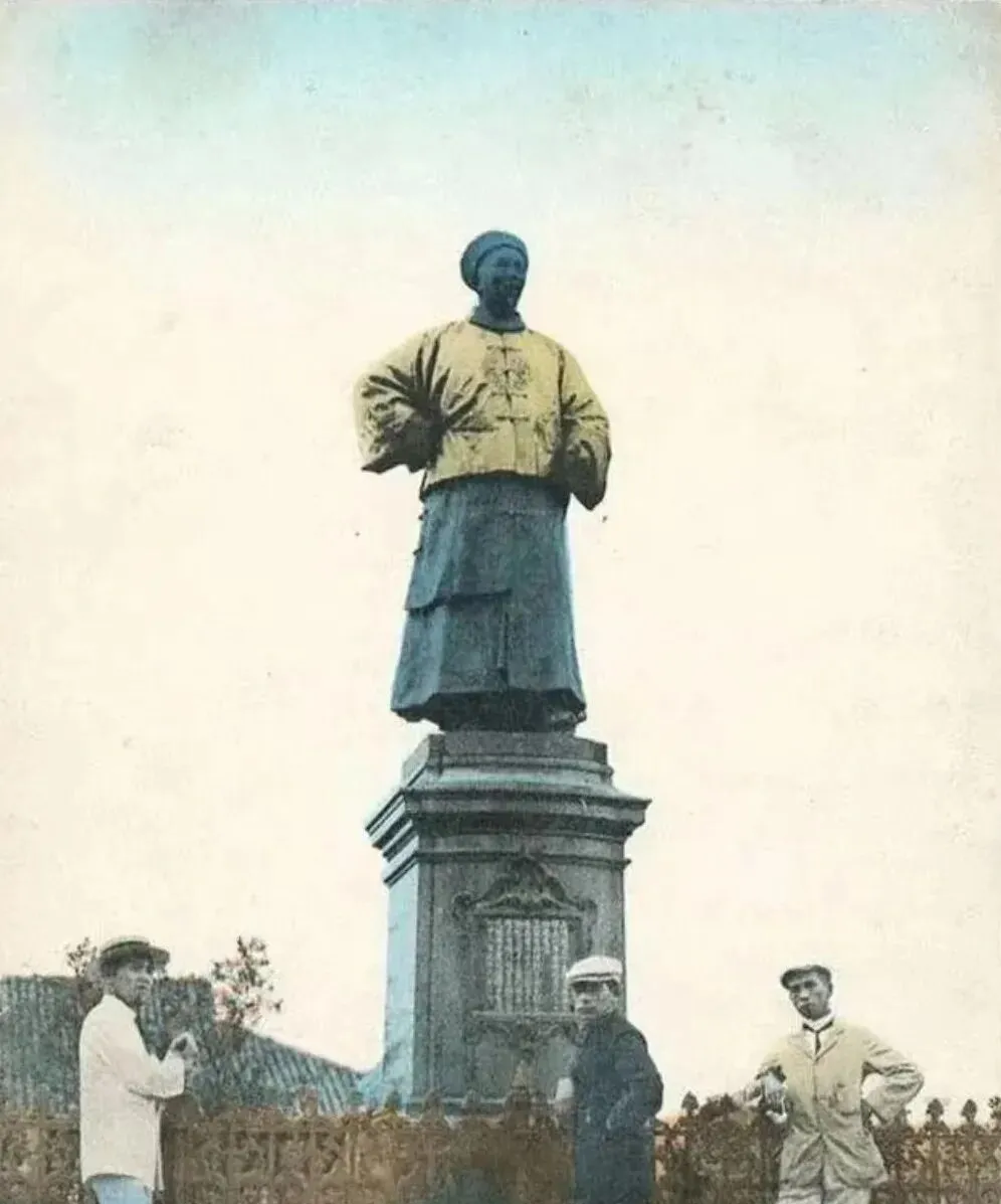 这尊铜像穿上了短褂,黄绸子一裹,冬天的风一吹衣摆鼓起来,台基下站着三个路人,兜里插着手,抬头看,像在打量一个老邻居,三言两语就能聊半天。