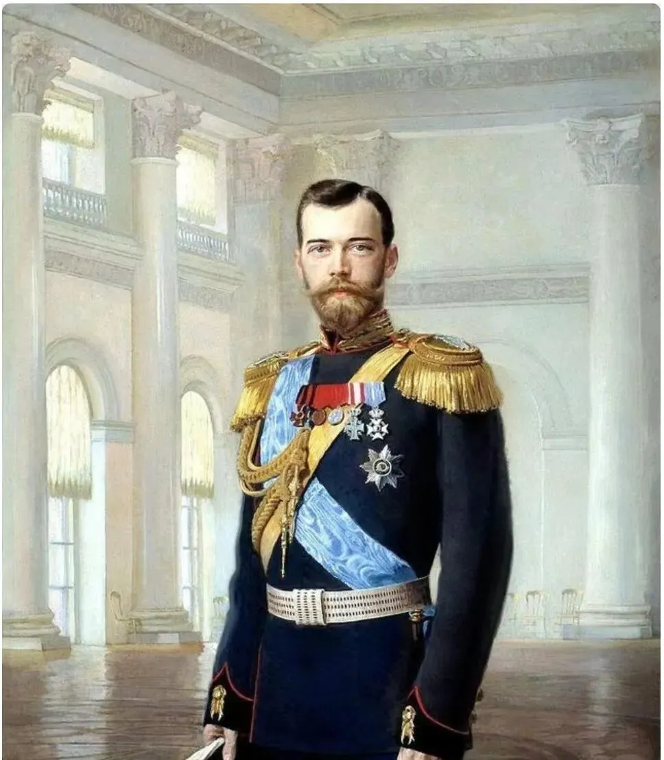 这幅肖像挺拔,蓝缎肩带压住金色流苏,胸前星章一枚挨一枚,背景是高挑的穹顶和落地窗,地面亮得能照出靴子的边,胡须修得很利落,站姿一寸不乱。