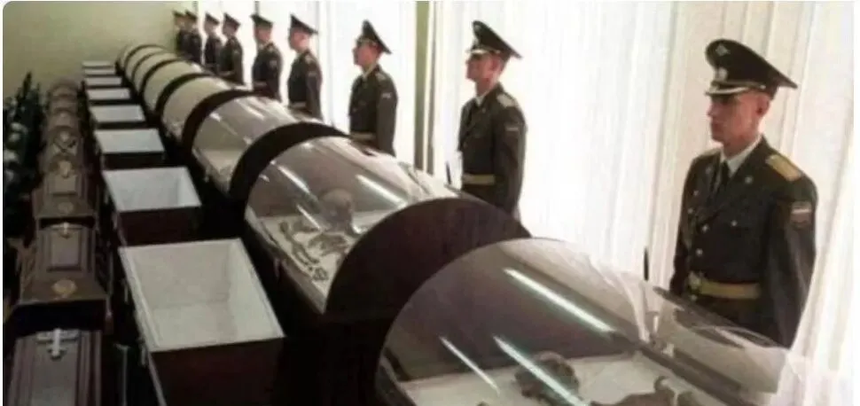 这排玻棺安安静静,士兵站在旁边,看得出疲惫却一动不动,盖子弧着亮,灯光打在上面,像一列沉默的弯月,屋里人声压得很低,谁都不愿出声。