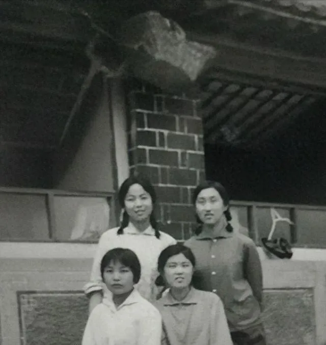 这一张屋檐下的合影,砖墙瓦房,四个知青排着站,脸上神情各有不同,小的眼含笑意,个子高的依旧梳着麻花辫,门口挂着大藤篮子,像是刚干完家务,没空讲规矩,只顾着按下快门,老房子后头有池塘猫和一片玉米地,印象里那个院子老是闹哄哄,一堆人进出,仿佛老时光就挂在梁上,一抬头就看见。