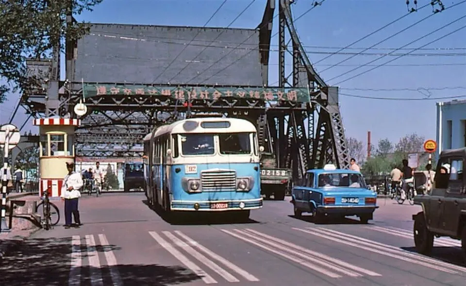 图中这座铁骨架是解放桥,桥身铆钉密密扎在钢梁上,抬头就是一片电车网线,像给天空梳的发网,桥头的小岗亭红白相间,玻璃窗里常站着交警叔叔,白手套一摆,车就乖乖停下了。那年我跟着爸过桥,正碰上开合桥演练,钢梁一点点起身,河里的拖轮呜一声从肚皮底下过去,围了一群人看热闹,旁边卖冰棍的小车叮当摇着铃,孩子们一口一个老冰棍,齁甜。