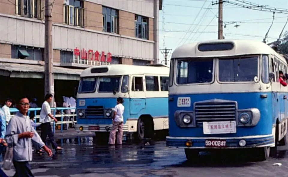这个站牌前停着两辆车头圆圆的92路,玻璃上贴着“讲究文明乘车”的红字,小贩挑着担子从人群里穿过去,地上水迹反光,像刚冲完地。爸说那会儿赶着去三条石亲戚家,常在这儿换车,车来得慢,大家不急,掏出布兜里的白面馒头咬两口,又把票折成尖叠着玩,车道上不按喇叭,顶多司机把头探出来喊一句再挪挪,这股子缓劲儿,现在都少见了。