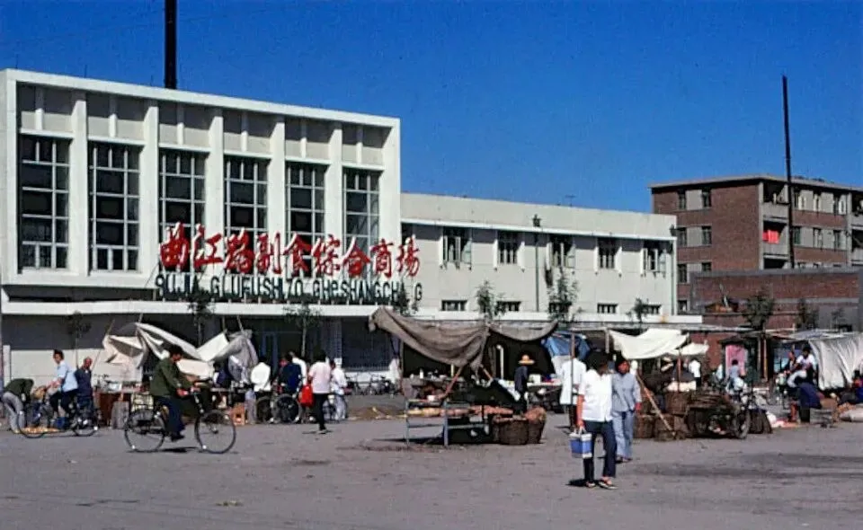 这个写着红大字的楼叫副食综合商场,玻璃窗成排立着,门前支着白布棚子,摊上码着鸡蛋篮子和豆芽筐,提着铝饭盒的、拎搪瓷提桶的,进进出出。奶奶说买散装饼干得自己带秤砣,掌柜舀一铁铲往秤盘里一倒,哗啦啦冒出香味儿,回家再装进玻璃罐,吃完见底了还心疼一会儿。现在超市灯光亮堂,东西摆得齐齐整整,可那股粮油味一走进门就扑脸来的劲头,真是回不去了。