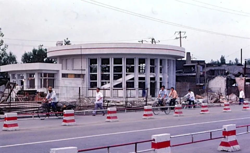 这个圆圆的家伙是正在盖的新建筑,白墙立柱一圈圈排开,像站了一圈兵,外围围栏还没拆,砖渣堆在脚边,路上骑车的人扭头看一眼就过去了。那时城里到处是这样的工地,旧的矮屋旁边生出新的楼,电线盘成麻花吊在杆子上,拉来拉去就把一条街点亮了,晚上回家窗台上能看见工地灯泡一闪一闪,像河里跳的鱼鳞。