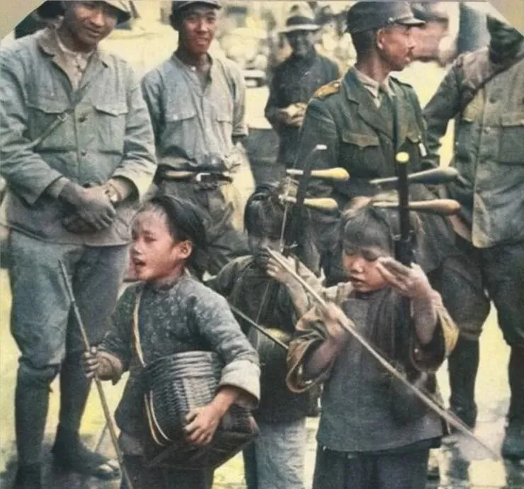 这个场景里的孩子拿着小竹筒要饭,旁边两个拉二胡,脚丫子都是泥点子,背后站着一群洋兵冷看着,她们唱一段换来几枚铜子,转头就得躲雨躲人,妈妈说那时街口最怕看到小小年纪拉弦子的,不是唱腔苦,是日子苦。