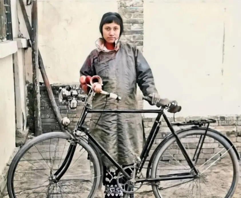 这辆黑杆细轮的家伙就叫老二八大杠,钢架笔直,刹车皮子硬邦邦,车把上还缠着白色握把,前边挂一盏圆灯,姑娘穿着油布围裙站在车旁,一手扶把一手搭在座后,像在说这可是家里最值钱的出门器,小时候我第一次学骑就是这种,脚尖够不到地,只能斜着屁股压着横梁滑,摔得膝盖青一块紫一块,也不肯下来。
