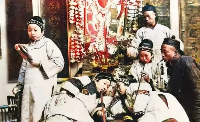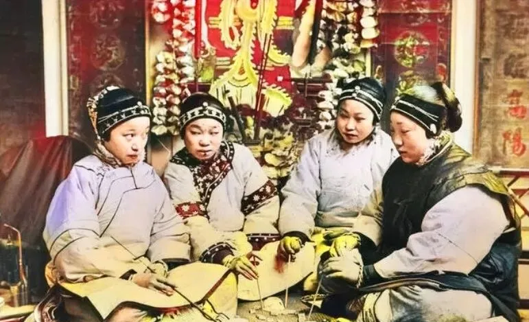 这两张里摆设讲究,案上供着红黄相间的神像,背后墙上贴满吉语,大袄滚边,手里拿的却是细长的管子,屋里雾气沉沉,奶奶摇头说,这玩意儿最耗人,一屋子热闹,实际都是空的,后来再看她们对坐做女工,窗下光线一束一束,手里在缝在剪,神情慢慢活过来,那会儿没网没戏,女人们就靠一针一线把日子缝密。