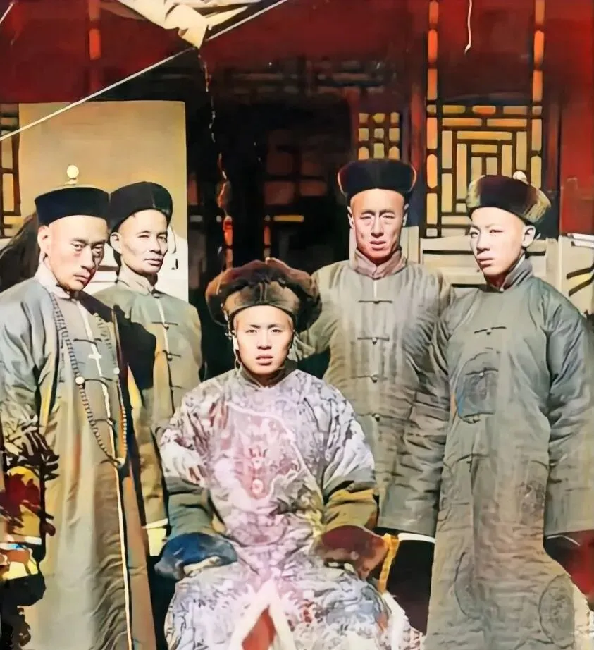 这个排排站的阵仗,一看就是府里要人拍照,前头坐着的是主位,后头四个侍卫面无表情,长袍马褂一色的灰青,帽沿压得低,站姿硬得跟门墩似的,那种“规矩”是穿在身上的,转身出了影楼,可能也就松一口气。