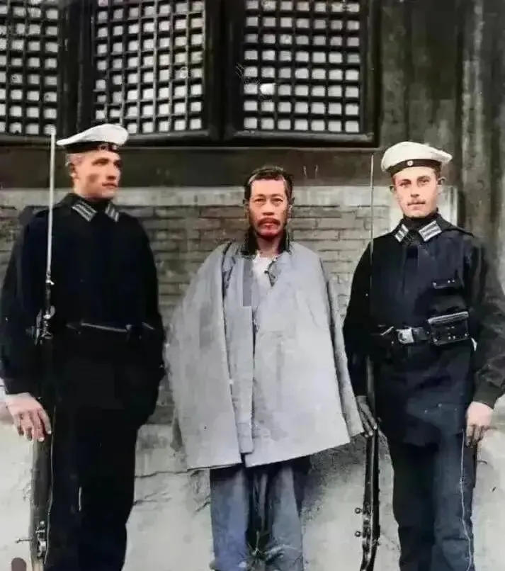 中间的人披着灰斗篷,左右各站一个洋兵,帽子白边黑带,肩上背着长枪,墙上的窗格一格一格,他眼神直直地看镜头,不凶也不怯,像在说你照吧,我也就这样了,那时的街口,最不想看的就是这种对比,一边是制服的亮,一边是民人衣裳的旧。