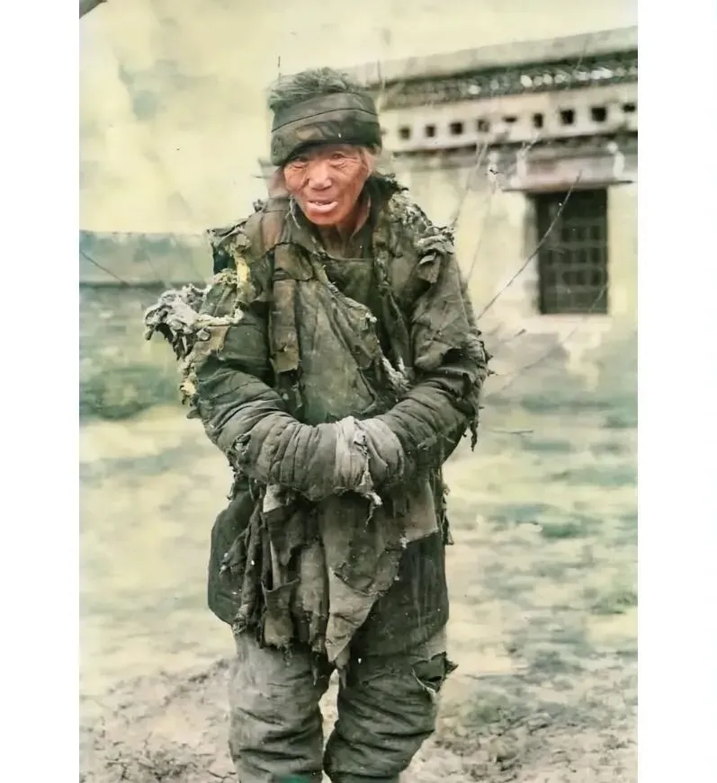 这身行头的补丁已经分不清原始布色,袖口用麻绳一圈一圈勒着,身后露出几段硬刺一样的枯枝,可能是用来挡狗或当柴火的,脸上的笑看着有点倔,说苦也苦,说不倒也不倒,小时候我见过冬天的拾荒人手上缠草绳当手套,握着铁钩翻垃圾,现在哪怕穿得再旧,手里也多半拎着手机了。