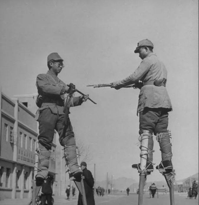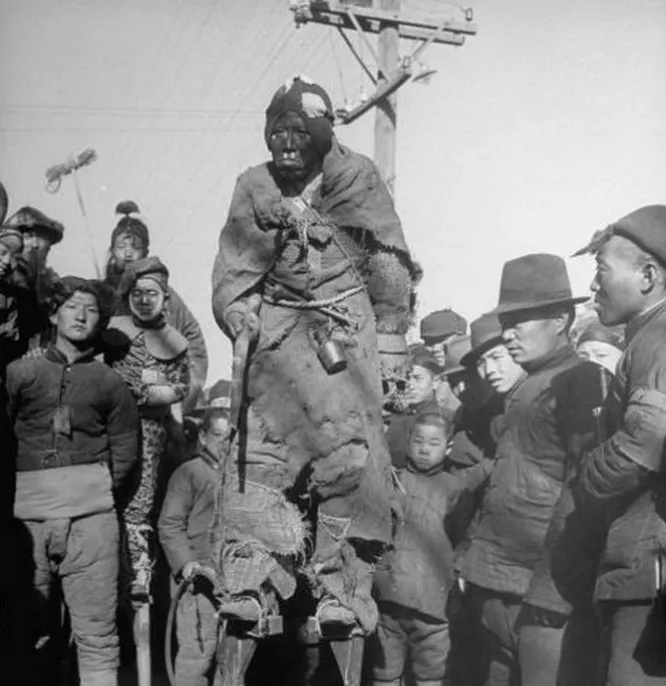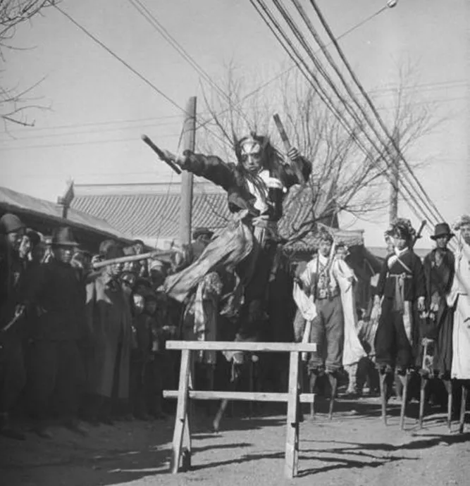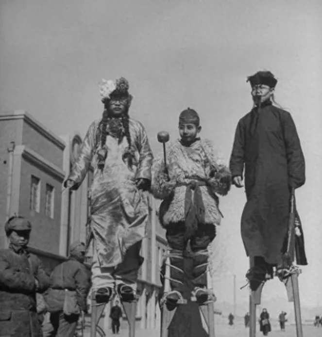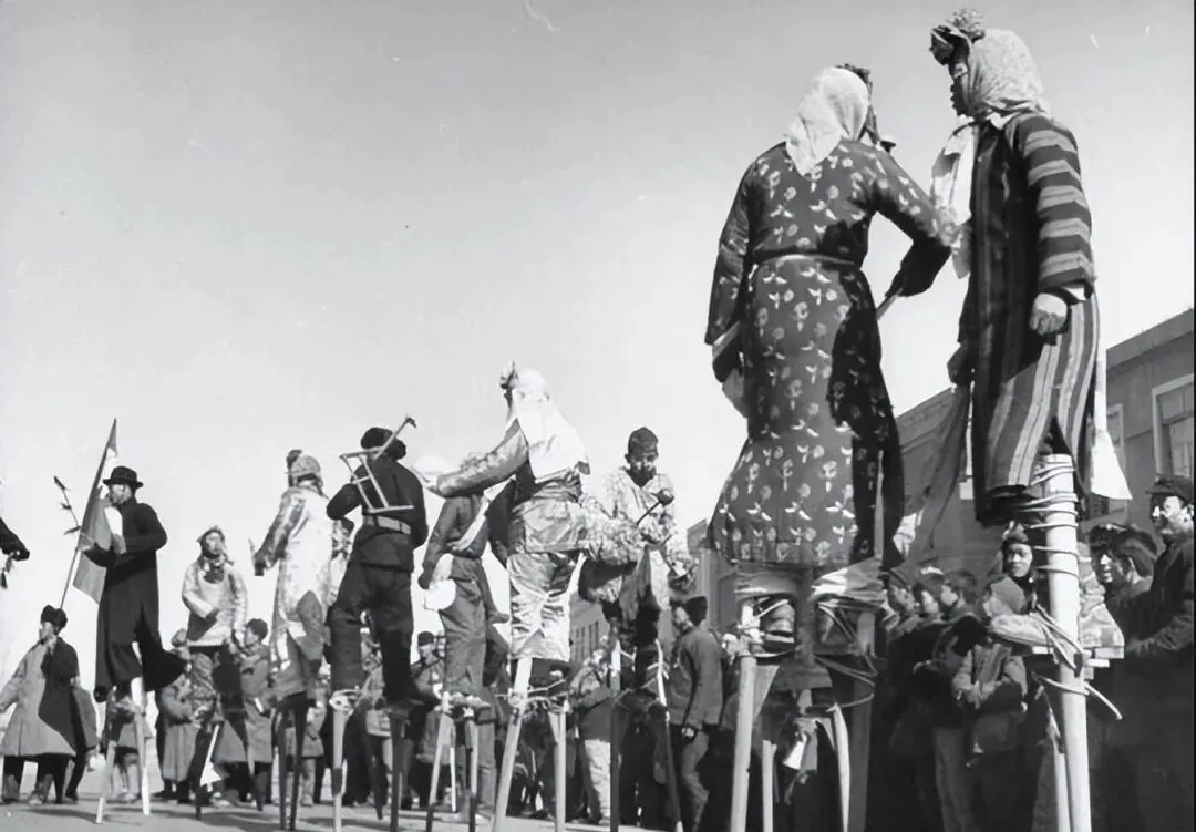这个高个儿玩意儿叫高跷,木腿细长,脚蹬子用布条麻绳缠得瓷实,演员脚腕一勒,往地上一点,整个人就拔地而起,披袍挂带的、扮老生的、学俏丫头的,全都在人堆上头飘着,风一吹,衣襟呼啦啦直响,走起“丁字步”来稳得很,奶奶说那会儿看高跷得抢前头占地儿,不然只听见人群里“哎呀”一声,影儿都瞧不真切。