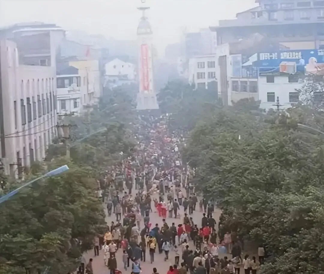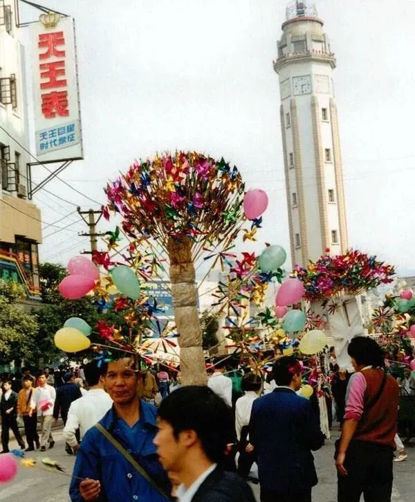 图中这条路口就是解放碑一带的主街,树荫下人潮涌动,远处立着笔直的碑身,小时候家里逢节就爱往这边来凑热闹,妈妈拎着布袋吩咐我跟紧点,生怕一转眼就丢了人,街边小贩一字排开,风车哗啦啦转,氢气球顶在天上飘,声音和颜色一起往耳朵里灌,热闹得很。