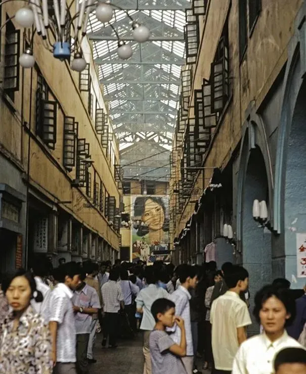 这条长廊一样的地方叫骑楼,铁窗整整齐齐探出来,屋檐下挤满了人,摊位上挂着衬衫背心,喇叭里反复喊着促销,最惹眼的是尽头那张大幅招贴,笑容热烈,像把整条巷子的光都点亮了。
