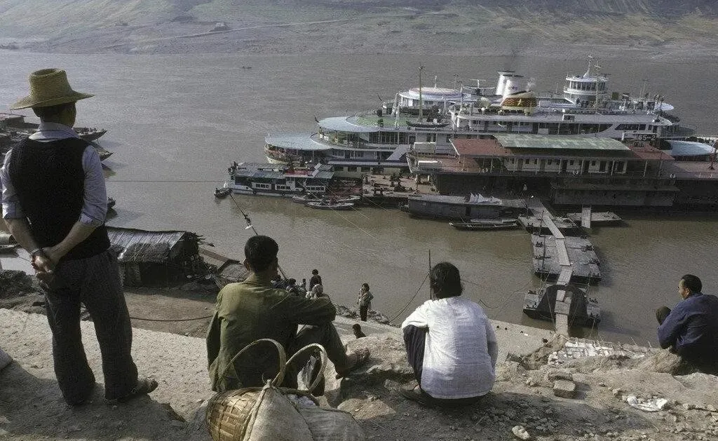 图里江水浑黄,靠着的几艘大轮船肚皮鼓鼓的,这里叫朝天门码头,是重庆人的江路,买票上船去万县去涪陵,棉被卷成筒,篮筐里塞满花生馍馍,爸爸说夜里江风大,甲板上要裹紧点,汽笛一响,整座城都跟着动了。