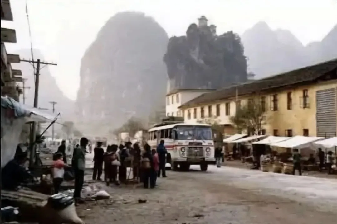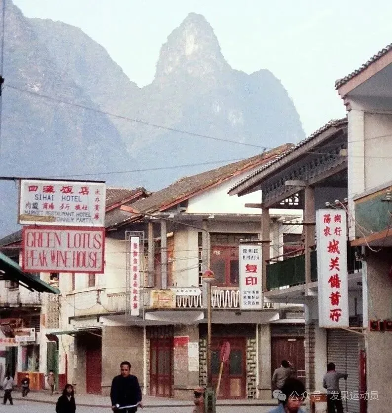 那时的漓江澄澈如未染尘的碧玉,艄公撑着竹排穿行于峰林之间,山水如画,满目诗意。街头不见人潮,蓝布工装与灰瓦木屋勾勒出朴素底色,老人、孩童、青年脸上都挂着未经修饰的笑。双语旅社和饭馆招牌悄然出现,旅游经济在此悄然萌芽。