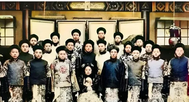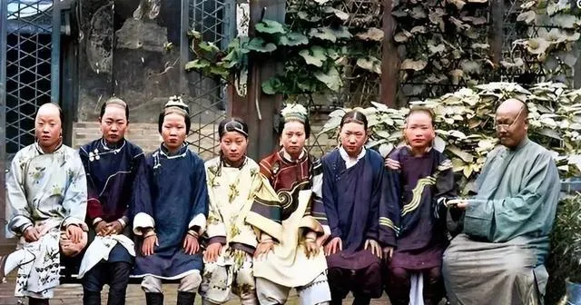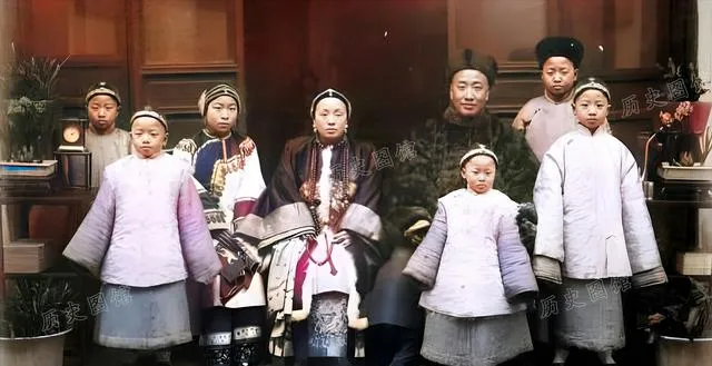 这张合影里的人家是王爷一家,穿狐皮褂的男子端坐,中间的老妇人稳稳当当,左右一溜孩子排成队,男孩女孩分不透,看头饰就知道辈分不小,妈妈看见这张笑我,你别瞎猜排座次,人家规矩多着呢,现在合影张张笑开花,以前拍照一板一眼,眼神都往里收着。