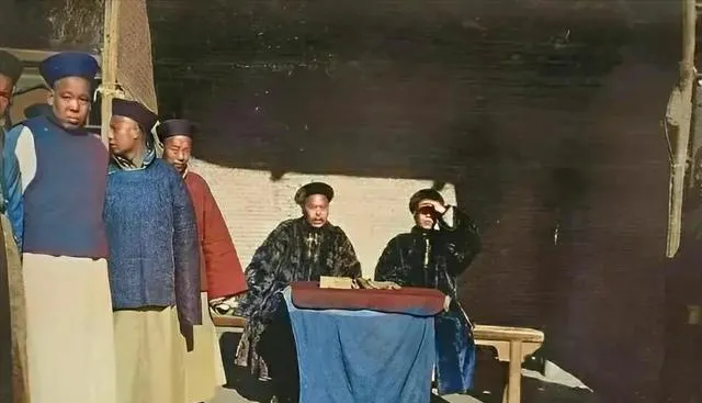 两位穿貂皮的叫监斩官,坐在案前抬头看日头,等的是午时三刻,桌上摆着木牌和笔砚,阴影压下来像一堵墙,这张照片一冷一热,冷在皮毛的光,热在旁人偷瞄的眼神,现在看表看手机,一点到就响,当年抬头看天才算准。