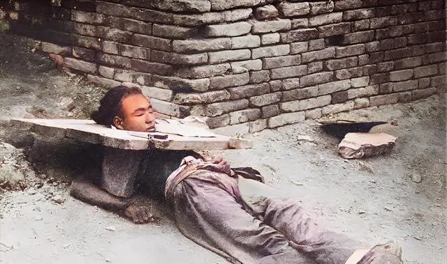 这个木框叫枷,沉得很,男人横着倒在地上,脖子被卡得紧,砖墙的角落灰蒙蒙的,路人多半绕着走,外婆叹一句,好好过日子别惹官司,现在讲程序讲律师,以前一块木头就把人压服了。