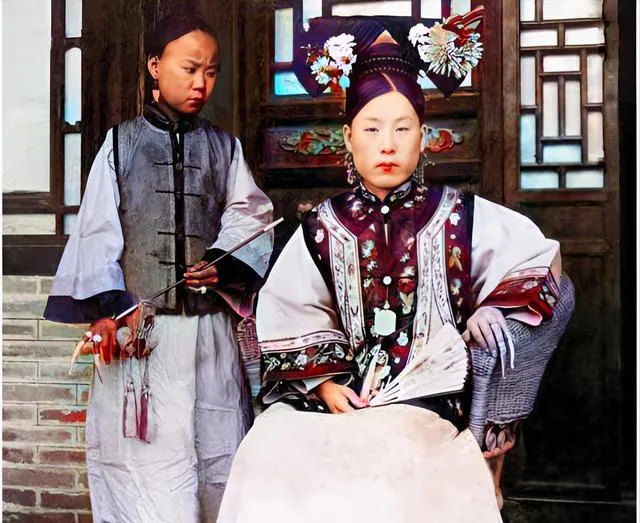 坐着的这位头上戴旗头,衣襟上压着绣片,手里团扇轻轻一搭,身后丫鬟拿着拂尘,眼尾往下斜,屋门的拼格子亮着光,穿戴一上身,气派就不声不响地站起来了,现在穿礼服拍照一回,平常还是运动衫最顺溜。