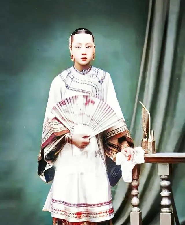 这个小姑娘手里的折扇开成半圆,白纱衣边钉着窄窄的花边,耳坠一对小金环,桌上立着笔洗和烛台,眼神不闪躲,像在台上等鼓点,妹妹看见说衣裳真好看呀,我说好看归好看,走路可不轻松。