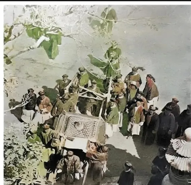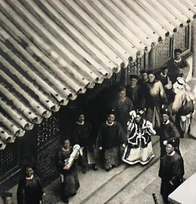 台阶下去一串人,是宫里出行的阵仗,轿子没入镜,衣摆拖着线,侧边有人抬手挡光,听老人讲那会儿相机不让随便进宫,这一张八成是偷着按的,现在手机举起来谁都习惯,拍多了反倒没这股稀奇劲。
