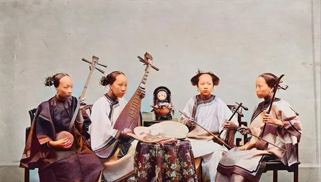 图中四件乐器从左到右是三弦、琵琶、大广弦和六角弦,桌上摆着鼓和拍板,她们坐定不笑,指尖搭在弦上像刚试了个音,师父说过,开嗓之前茶别喝太烫,嗓子一紧戏就散,现在舞台灯亮得耀眼,那时一盏油灯也能照出一段好曲子。