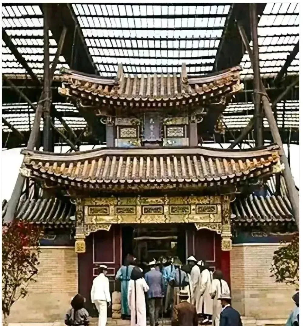图中这道影壁样的门楼叫牌坊式宫门,歇山重檐,黄绿两色琉璃瓦叠着往下压,檐口斗拱花纹一圈又一圈,门洞不大,人却不少,前头是戴礼帽的外宾,后面排着长衫蓝褂的随行,老照片上色不算完美,细看梁枋上金漆彩画还在闪,说明那天光线挺足。