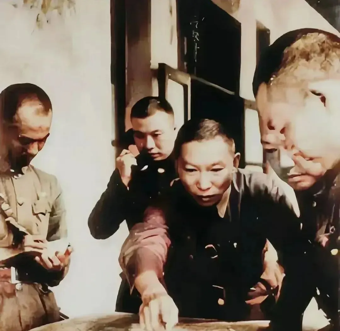 这张屋里光线偏黄,几个人围着一张桌,指节按在地图褶皱处,旁边有人扶着电话听筒,纸笔咯吱作响,脸上都是紧绷的神情,战时会议就这么开,话不多,动作快,门外风一吹,窗纸抖了一下,像是给这张照片加了个短促的停顿。