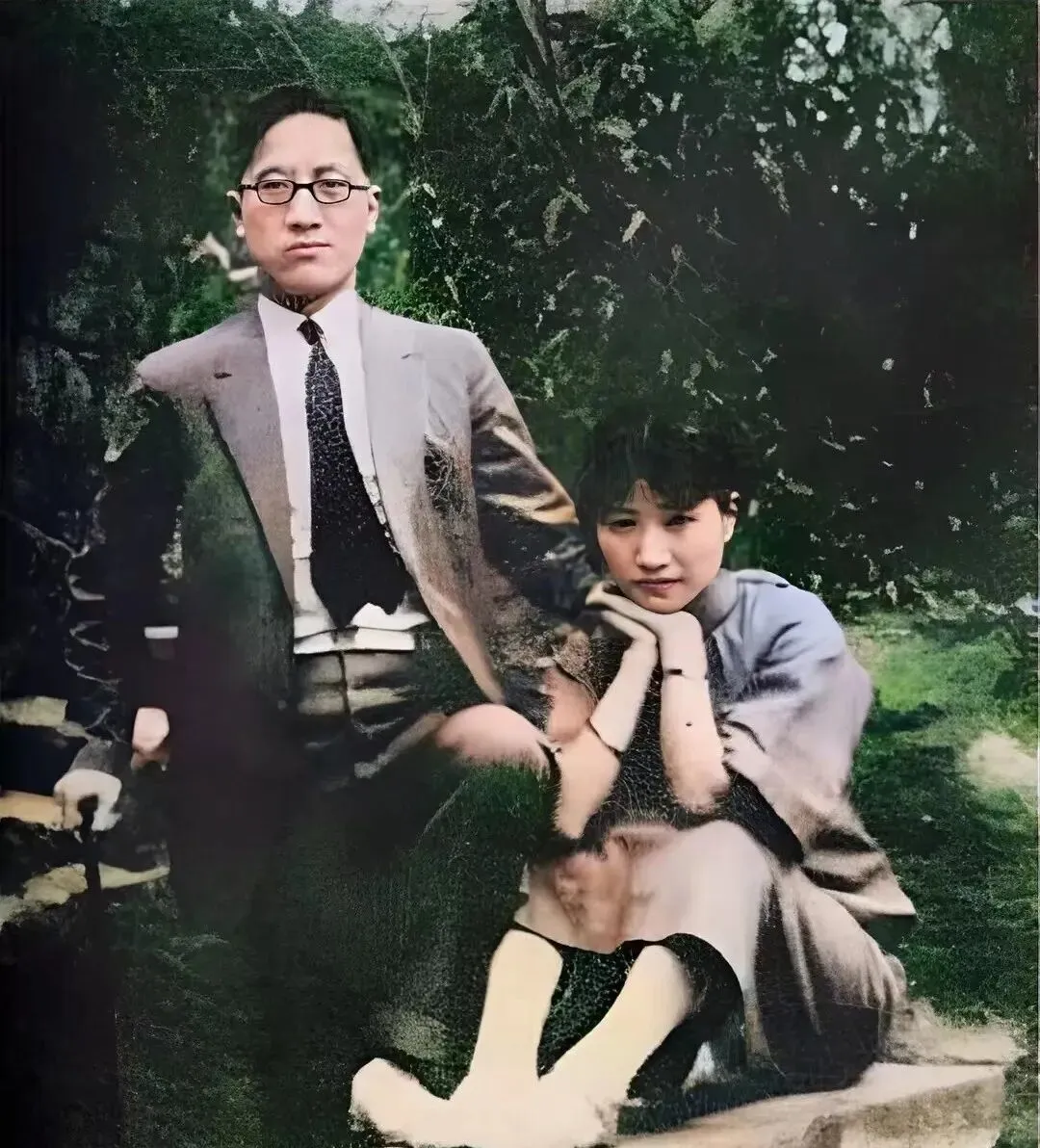 这张坐姿很讲究,男士西装三件套,领结规矩,女士倚在台阶边,手肘托腮,旗袍面料在光里泛着细细的光点,草地颜色厚重,像油画上抹过一层清漆,老城的后花园常常就是这种味道,安静里透着讲究。
