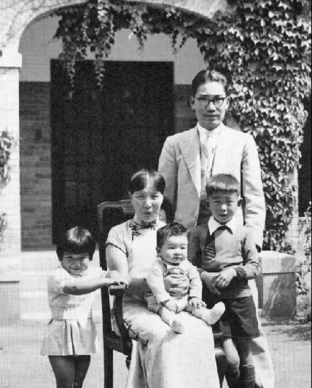 门洞是半圆券拱,匾额下挂着藤蔓,孩子一个个挨着大人站,最小的坐在妈妈腿上笑成一朵花,爸爸戴着细边眼镜站在后头,腰背很直,老一辈拍全家福,讲的是排位和气口,先长后幼,先内后外,规矩不多,却人人懂。
