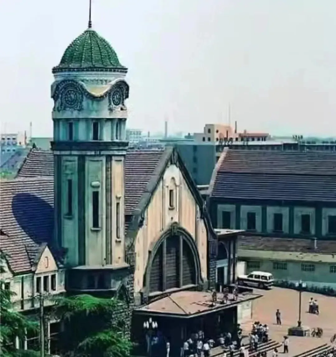 这个带绿顶的钟楼就是老车站的标记,塔身竖直的壁柱压着,玫瑰花窗嵌在中段,主厅拱券高高挑起,站前广场不大,人群在阴影里躲阳,远处屋脊一排一排,屋瓦是深灰色,妈妈说以前坐车要提前去候车室排凳子,现在手机一扫,车次全在屏上了。