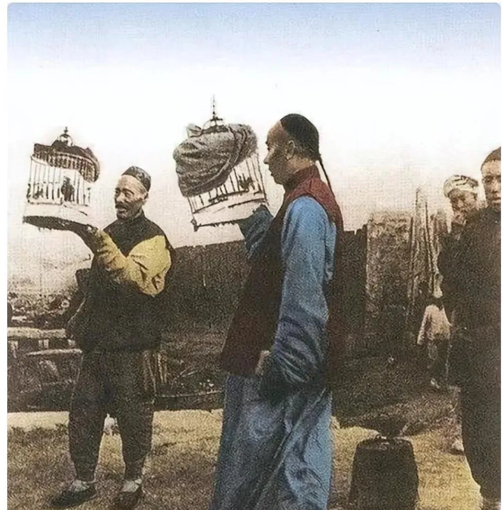 这两个老哥一个戴瓜皮帽,一个扎小辫,手心托着雕花鸟笼,笼盖半掀着,里面的小家伙侧着脑袋,木条细而直,笼脚是弯云纹,城外风大,袖摆呼啦啦地晃,爷爷说那时讲究养气,清早沿河走一圈,鸟唱,人也舒坦。
