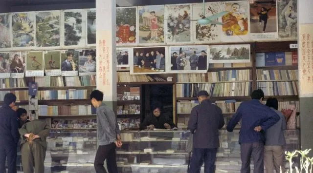 图里这排柜台叫新华书店的旧柜台,玻璃面反着天光,后墙一溜儿年画,新书老刊码得整齐,掌柜的手伸出来递本子,外头人挨个问价,小时候我爸说有了新课本就去这儿盖章拿票,排到傍晚也不急,回家路上本子靠在怀里暖乎乎的。