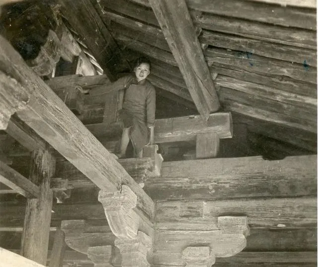 这张屋里都是木梁,图中这个位置叫斗拱和梁架,枯灰色的木头被手汗磨得亮,谁踩上去都得憋住气,奶奶说老屋顶上的榫卯结实得很,没钉子也不晃,现在看见钢筋水泥多了,像这样细细的木味儿倒难闻到了。