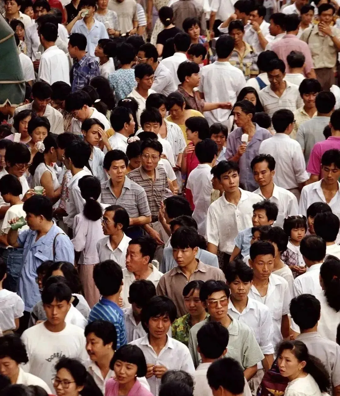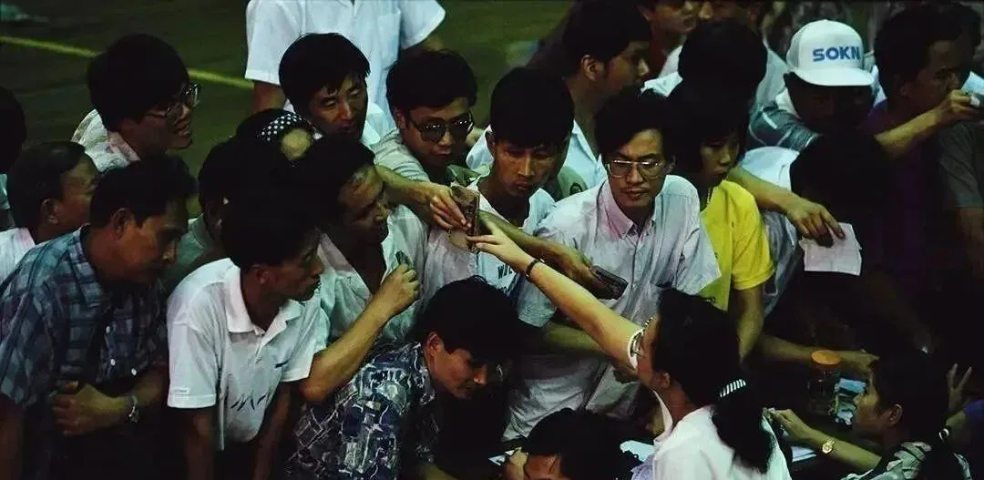 这张里有个小细节,男士们流行金丝边或黑框大眼镜,配浅色短袖衬衣,口袋里插圆珠笔或者香烟,挤在柜台前递钱,袖口被汗浸得有点塌,实用第一,造型却无意间统一了街头审美。