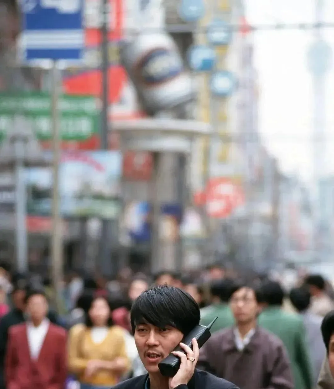 这个黑乎乎的砖头手机叫大哥大,拿着它的人多半配一件灰黑西装,夹克式或两粒扣,裤腿直直地垂下来,腰间别个钥匙扣,走起路来风都往身上赶,我记得表舅第一次拿着它回家,边走边摆手说“喂喂信号好伐”,我们几个小的跟在后头起哄,这阵仗现在看也挺拽。