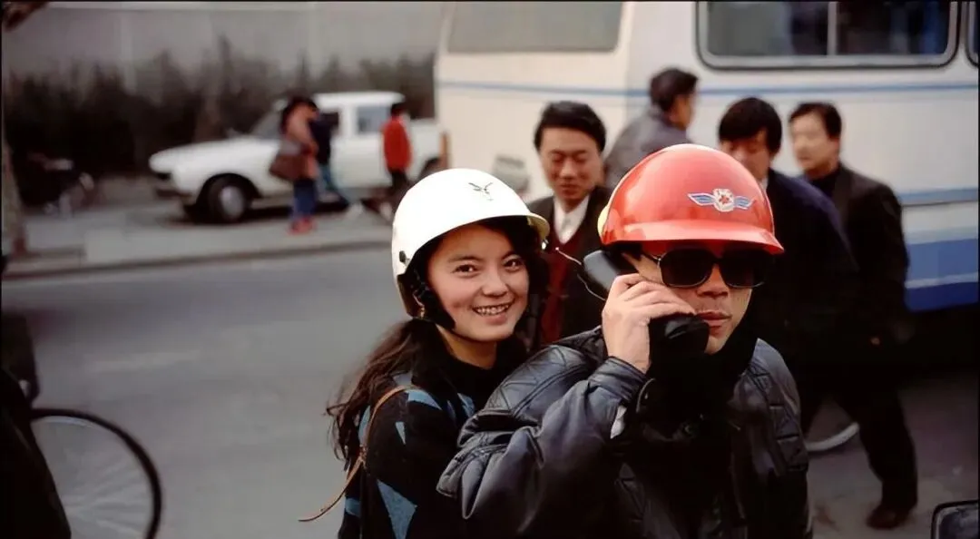 这身黑色机车皮夹克,肩膀鼓鼓的,胸前拉链发亮,红白安全盔外加大墨镜,后座姑娘穿针织开衫,笑得特别甜,那个年代的酷就这么直接,油门一拧,风把衣角吹得猎猎作响。