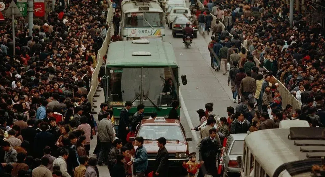 这张拥挤得厉害,绿皮大巴卡在中间,人潮两边漫过去,街上年轻人多穿蓝黑色夹克,面料有的像风衣有的像化纤壳子,肩头垫一点肩线,拉链拉到胸口,里头露出条纹毛衣,简单好搭。