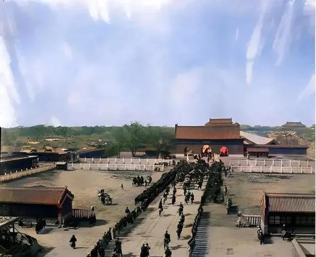 你看看这一列黑压压的人马,队伍蜿蜒着从宫门大开口过来,正殿门前铺着粗大石板,两边是白石栏杆,红伞轿子打头,慈禧太后和光绪帝的回銮画面,比起戏台上谁的出场都气派得多,旁边站着挤挤插插看热闹的护卫兵卒,远处灰蒙的山和树衬出一股张扬,过去皇家排场确实不是吹的,现在皇宫成了风景区,人走光了,剩下回音才让你品出滋味。