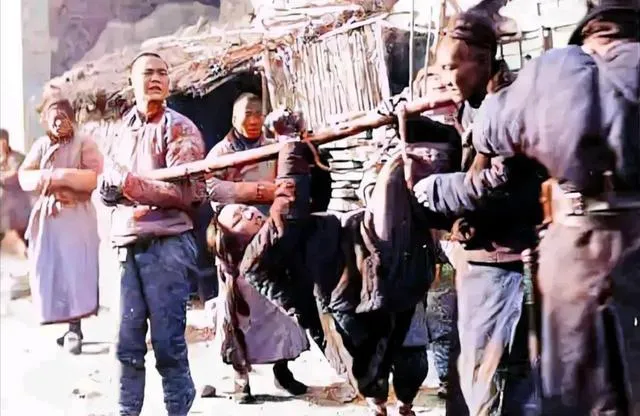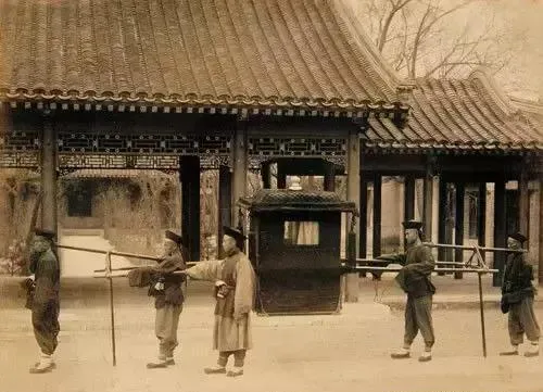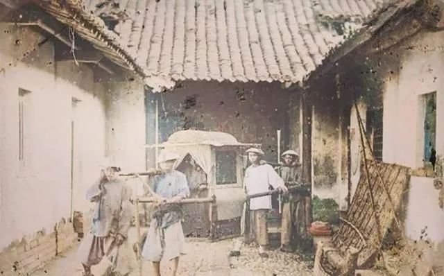 再看这张,是清宫大院内部,四人抬轿,轿子颜色瞅着发灰,可也是特供官员用的,爷爷有年跟我说,这玩意不是谁都能坐,上面有讲究,四品官才能配四抬夫,抬起来步伐压得整整齐齐,屋瓦下人影细细拉长,碰上下雨天,轿帘一挡灯影斑驳进去,那时候走在府衙深巷里,你都不敢跟着太近。
