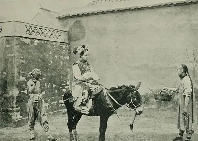 路口见着这一幕叫旗人妇女骑驴出门,身上的花绣衣服走路都哗啦哗啦响,脚下踩的是黑面小绒鞋,头发梳成又高又滑的髻,旁边是家里伺候的丫头背着篮子跟在后头,小时候看《还珠格格》,总觉得那剧里侍女跑来跑去挺热闹,其实照片上的生活才接地气,走亲串门但凡有驴骑都算给自己争光了。