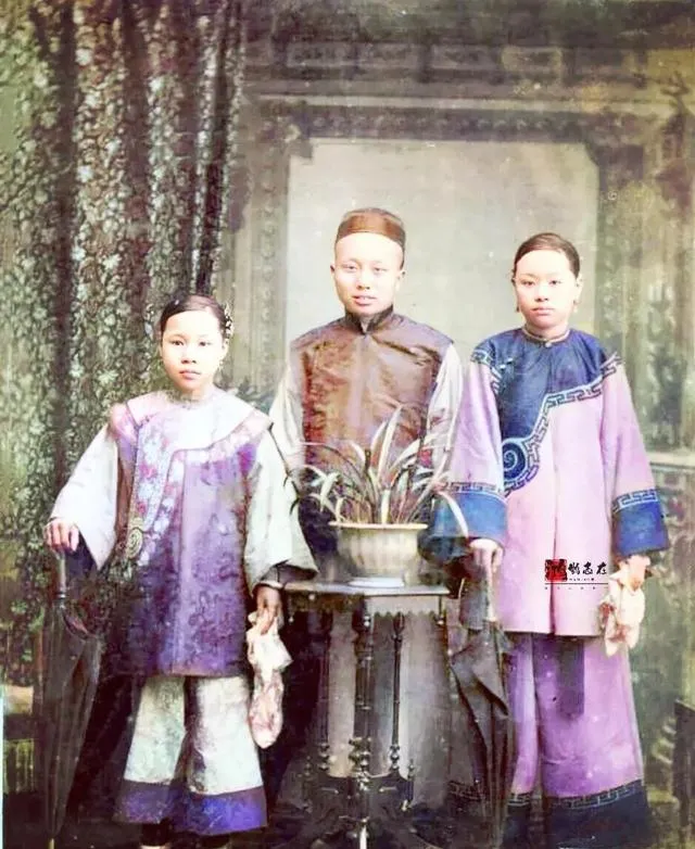 三口人马马虎虎站在缎帘前,男的女的小孩各有一套新衣服,这种照片在清末能留下,家里肯定有两把刷子,仔细看小姑娘的侧脸圆乎乎的,爸爸的手搭在她肩上明显是老派那套家风,老照片的色调总带点发旧的香味,仿佛从戏台上跨下来,落回自家灶台边。