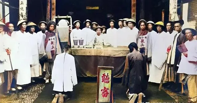 官老爷坐中间,案头横着对联,两边站着一溜兵丁,跪地的是俩犯人,这才是真正的听差审案场景,没什么“包拯脸黑”的气场,反倒人多嘴杂,气氛压得人人噤声不敢出头,隔老远也能听到打板子的声音,小时候村里谁闹点事情也学着支个案几装模作样,和这种场面差着一段火候。