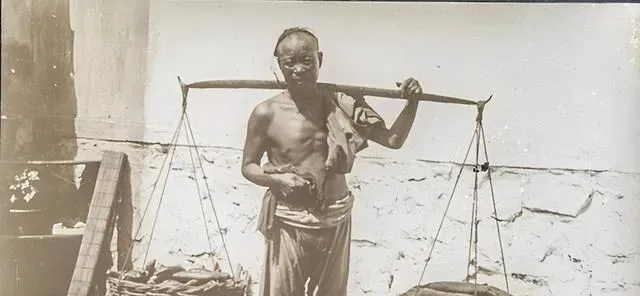 这个肩上压着木扁担的汉子就是货郎的命,左边蔬果右边杂件,裤腿卷到膝上,肋条一根一根清楚,太阳一烤皮子发亮,走一步肩头一沉,竹篮子跟着晃,外公说早年在集口看见这样的多,能不讲价就不讲价,省着点力,好把下一趟再挑回去。
