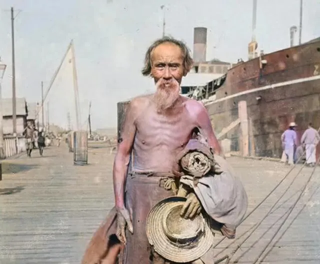 这个手里攥着草帽的老者,臂弯夹着卷毯,衣襟破得能见皮,身后桅杆林立,海风把胡子吹得乱,脚步往前两下又悬住,像在心里盘着下一顿在哪儿落,照片把他那点不愿被看见的犹豫定住了,苦是真苦,可人还护着脸面的直。