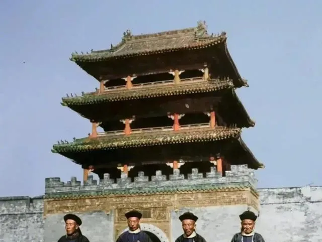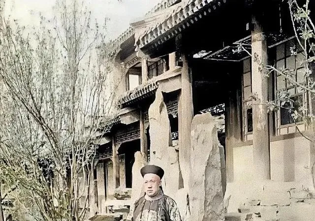 这个人站在假山和廊柱之间,衣襟宽大,朝珠垂到肚子,背后窗棂细细密密,树影斑驳,把场面撑得雅,外婆说这种站法是有讲究的,脚尖对砖缝,肩不塌,镜头里就不露怯,现在拍照谁还琢磨这些,手机一抬就完事。