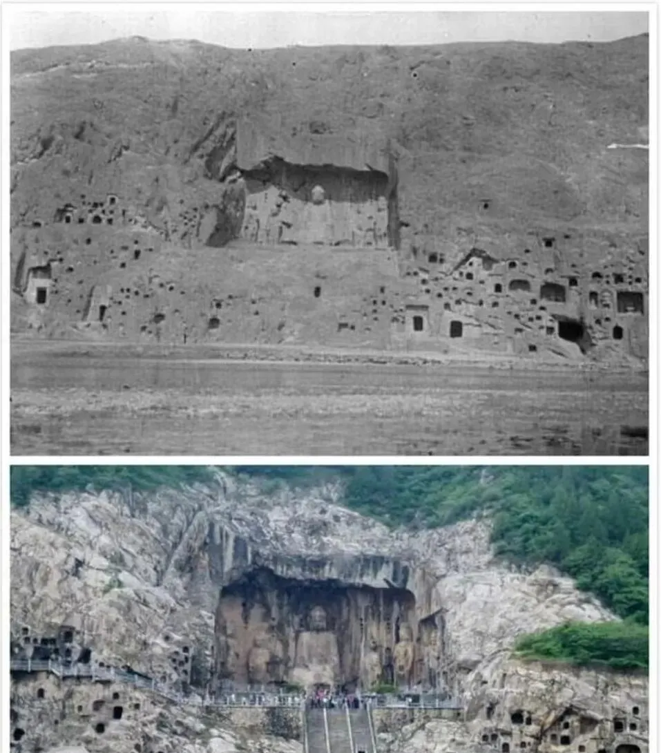 图中这一对上下对比的影像叫龙门石窟旧照与今景,早年的山体干枯荒凉,洞窟密密麻麻像针眼,河床露着骨感的石脊,现在绿意一上来,台阶灯带人潮,全是热闹的气口,站在伊河边一想,以前风吹石屑刺脸,现在手机抬手就是高清,同一个佛面,同一条水脉,眼神却不一样了。
