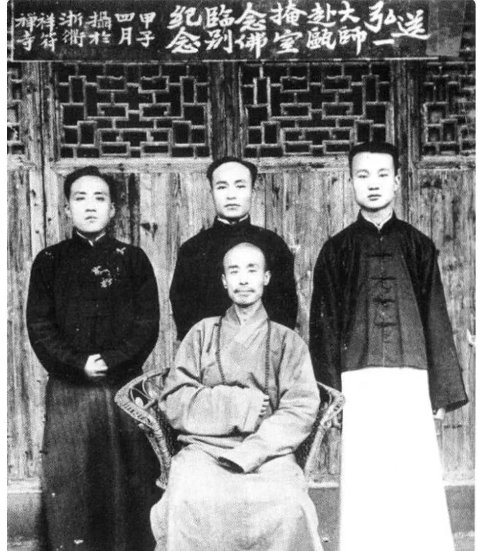 图中这位坐着的叫法师,瘦小的手放在膝上,三位青年站在背后,门楣上写着别字,木门格子像潮湿过又晒干,爷爷说他年轻时在寺门口打过伞递过茶,学问不在嗓门大,在心定,这张像就有那股定。